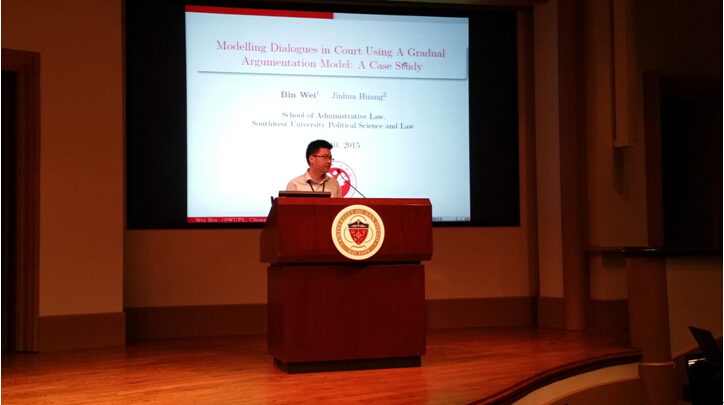 6月8日至12日,365betribo88研究员魏斌博士应邀参加了在美国圣地亚哥大学法学院举办的第15届国际人工智能与法大会(ICAIL2015),并且于10日作了大会主题发言30分钟,报告的论文是其与黄金华副教授合作的成果“Modeling dialogues in court using a gradual argumentation model: a case study”。