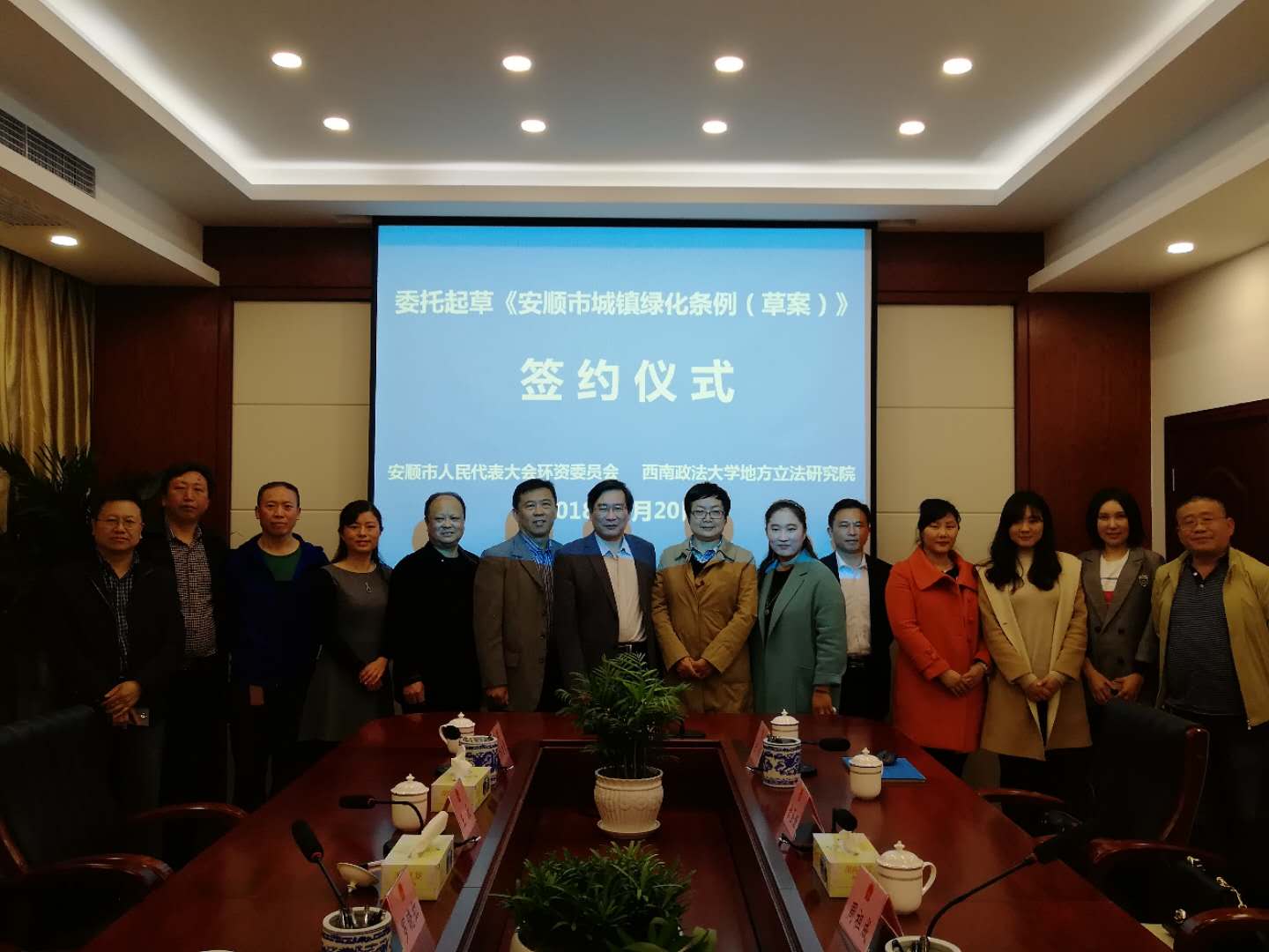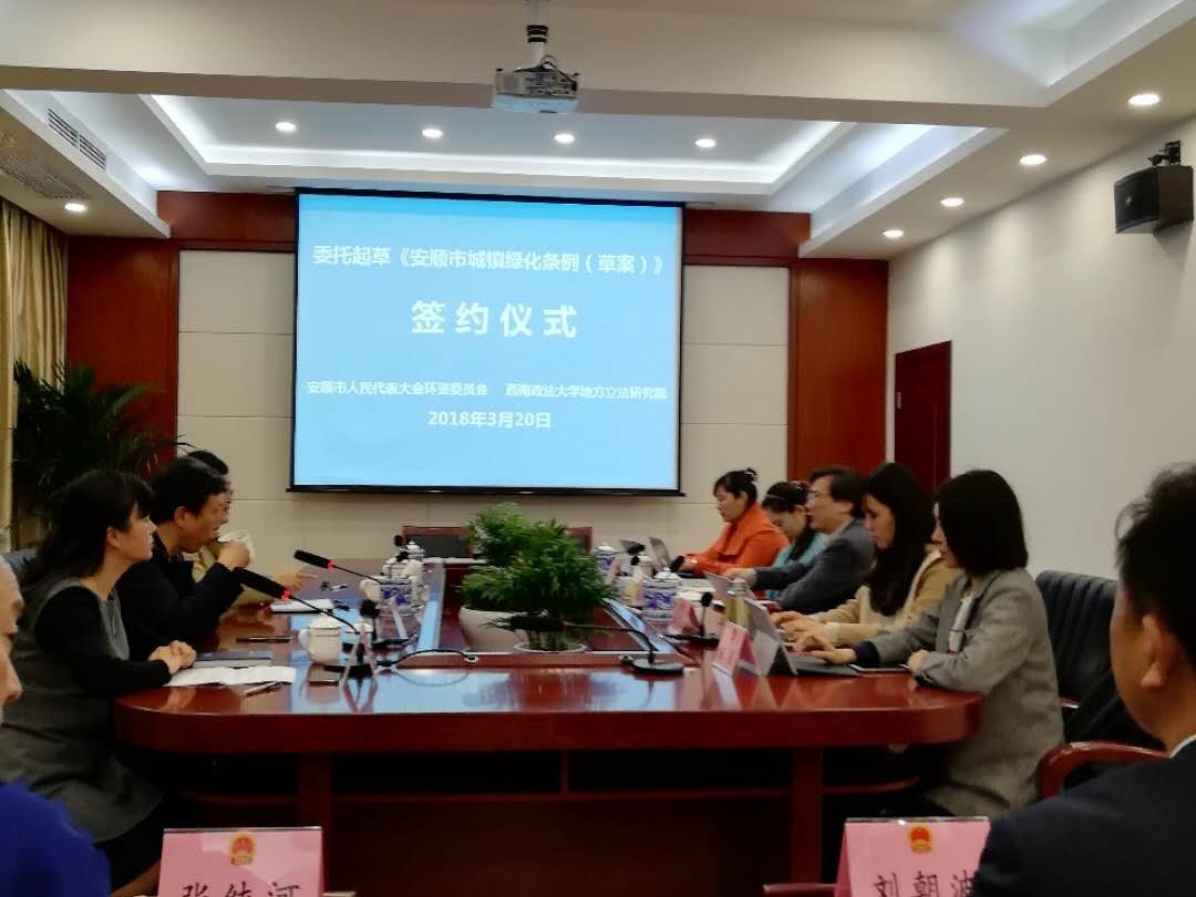 3月20日下午,《安顺市城镇绿化条例》委托起草签约仪式在安顺市人大常委会第一会议室举行。安顺市人大常委会副主任罗晓红、副厅级干部王跃,安顺市人大常委会副秘书长刘朝波,安顺市人大常委会法工委主任刘廷勇、副县级干部张纯河,安顺市人大常委会环资委主任程寿刚、副主任陈红敏,安顺市园林局局长邹晓怡、副局长廖前犀等出席。中心周祖成教授带队前往安顺参加签约仪式。签约仪式由陈红敏副主任主持。