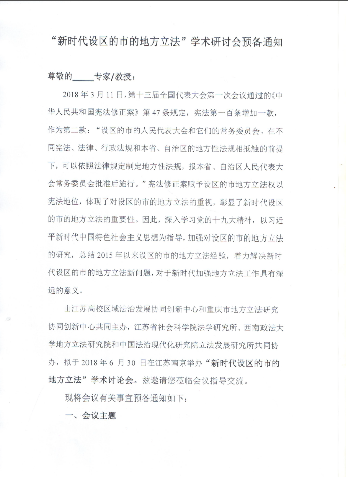 “新时代设区的市的地方立法”学术研讨会预备通知