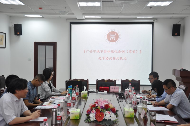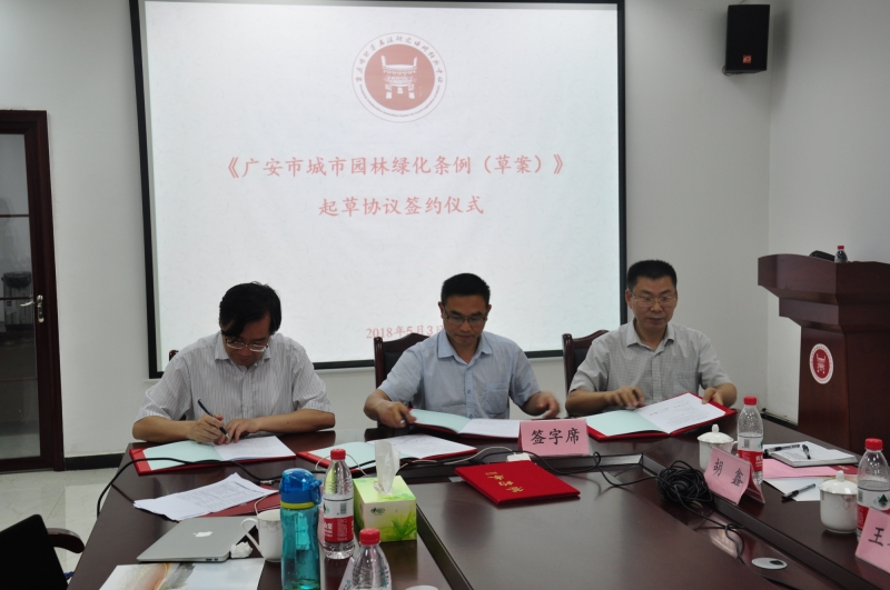 在就相关问题进行深度讨论后,广安市园林局作为委托方,学校作为受托方,广安市人大常委会法工委作为见证方,分别由代表人龚德军局长、周祖成教授和张学成主任共同签署了委托起草协议。
